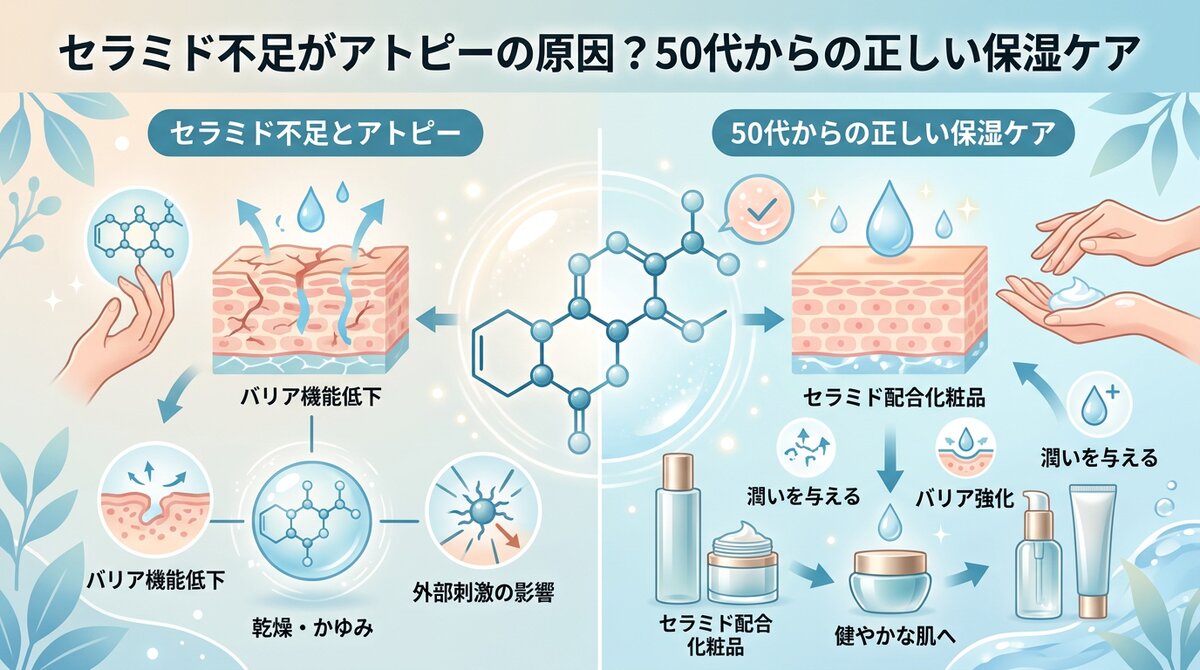 セラミドの欠乏がアトピー性皮膚炎の直接原因であることを、宇都宮大学の研究チームが世界で初めて実証した。50代ではセラミド量が20代の約半分にまで減る。自分や家族の肌トラブルに心当たりがあるなら、セラミド配合の保湿剤選びを見直すタイミングかもしれない。
